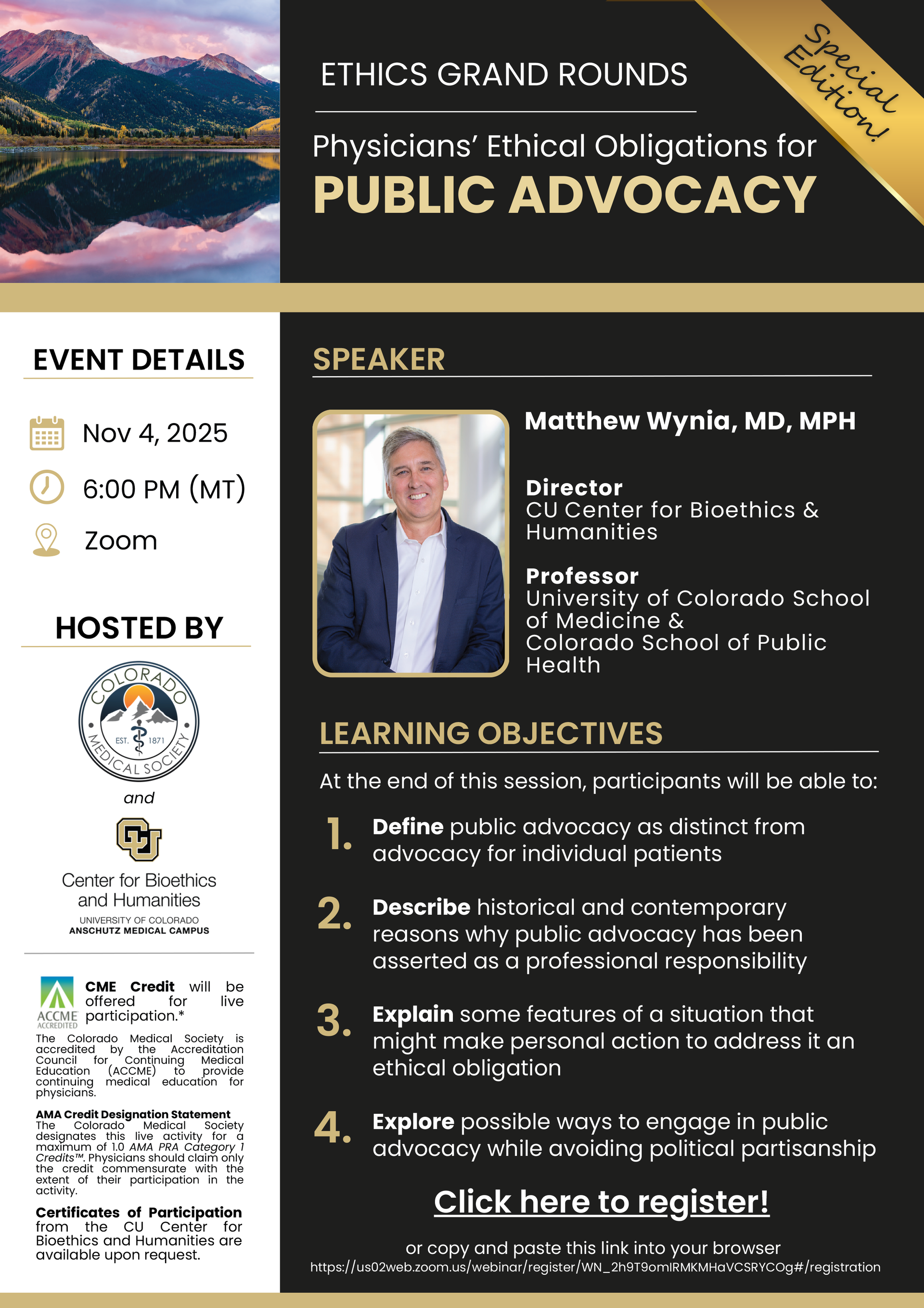 Webinar: Physicians’ Ethical Obligations for Public Advocacy (virtual) -Tuesday, Nov. 4, 6-7 p.m.; register