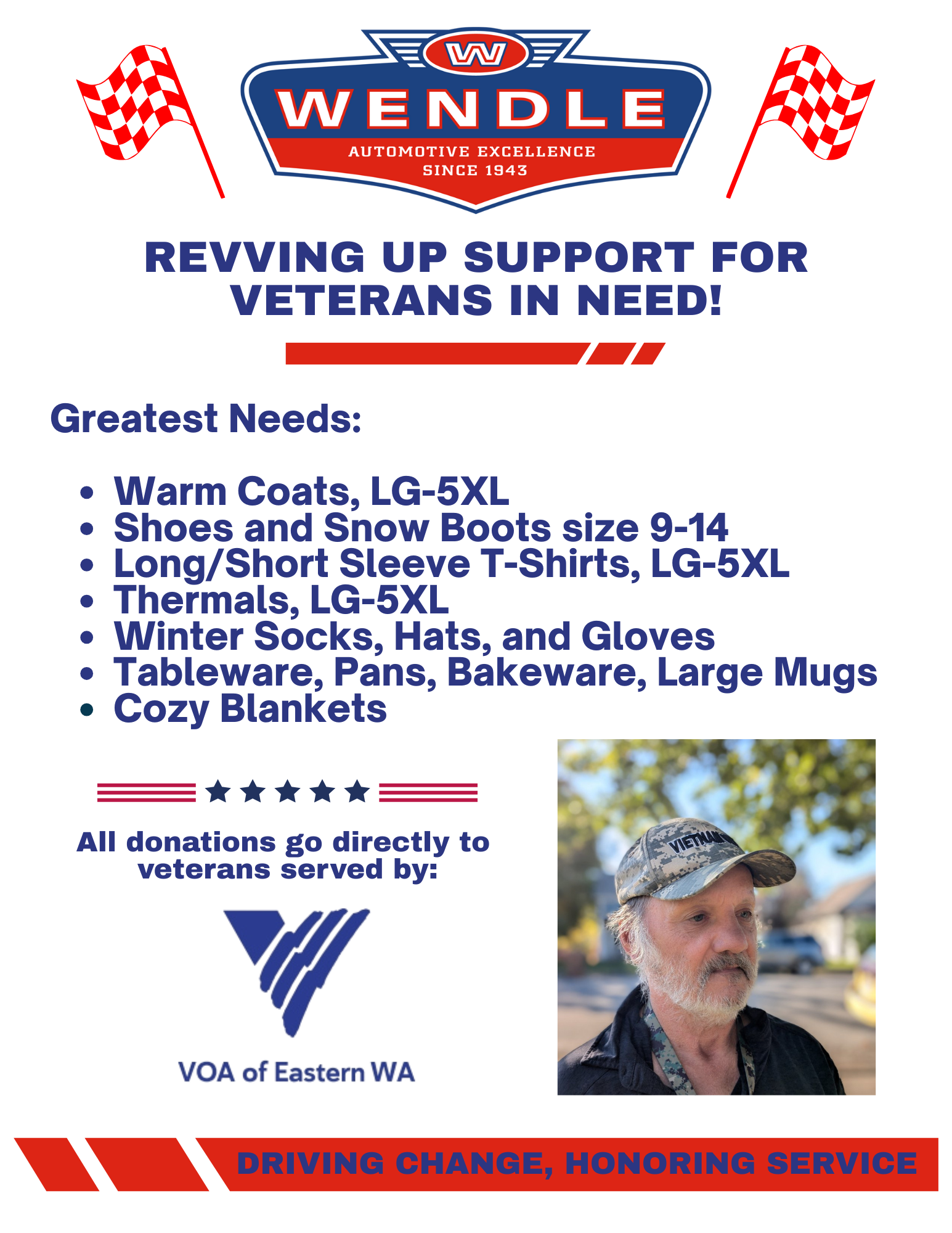 Help us spread the word! Share the flyer with friends, family, and neighbors, and join us in fueling hope for veterans in need this holiday season. Together, we can make sure every hero in our community feels honored and cared for. Thank you, Wendle Ford for driving change in all the right directions! |