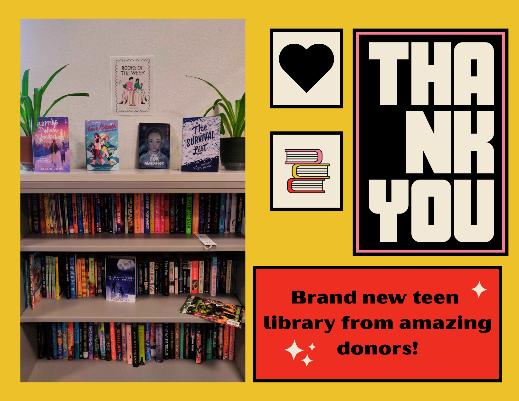 This library will be a refuge on hard days, a spark on curious ones, and a reminder to our teens that they are seen, valued, and deeply cared for. Thank you for filling these shelves and this space with so much heart. ♥️ |