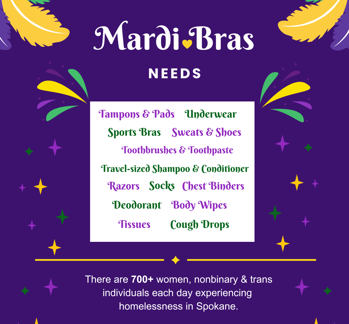 You can drop donations at any BECU location, all YMCA locations, Boots Bakery, VOA HQ on Haven St, or turn it into a celebration of generosity by hosting your own Mardi Bras party. We’ve included a handy one sheeter packed with fun, easy party ideas to get you started. And for those who prefer a drive by good deed, we’ve got you covered. Friday, February 20 from 4 to 6 pm, swing by Women’s Hearth, 920 W 2nd Ave, where one of our amazing volunteers will be there to greet you and collect donations without you ever leaving your car.
