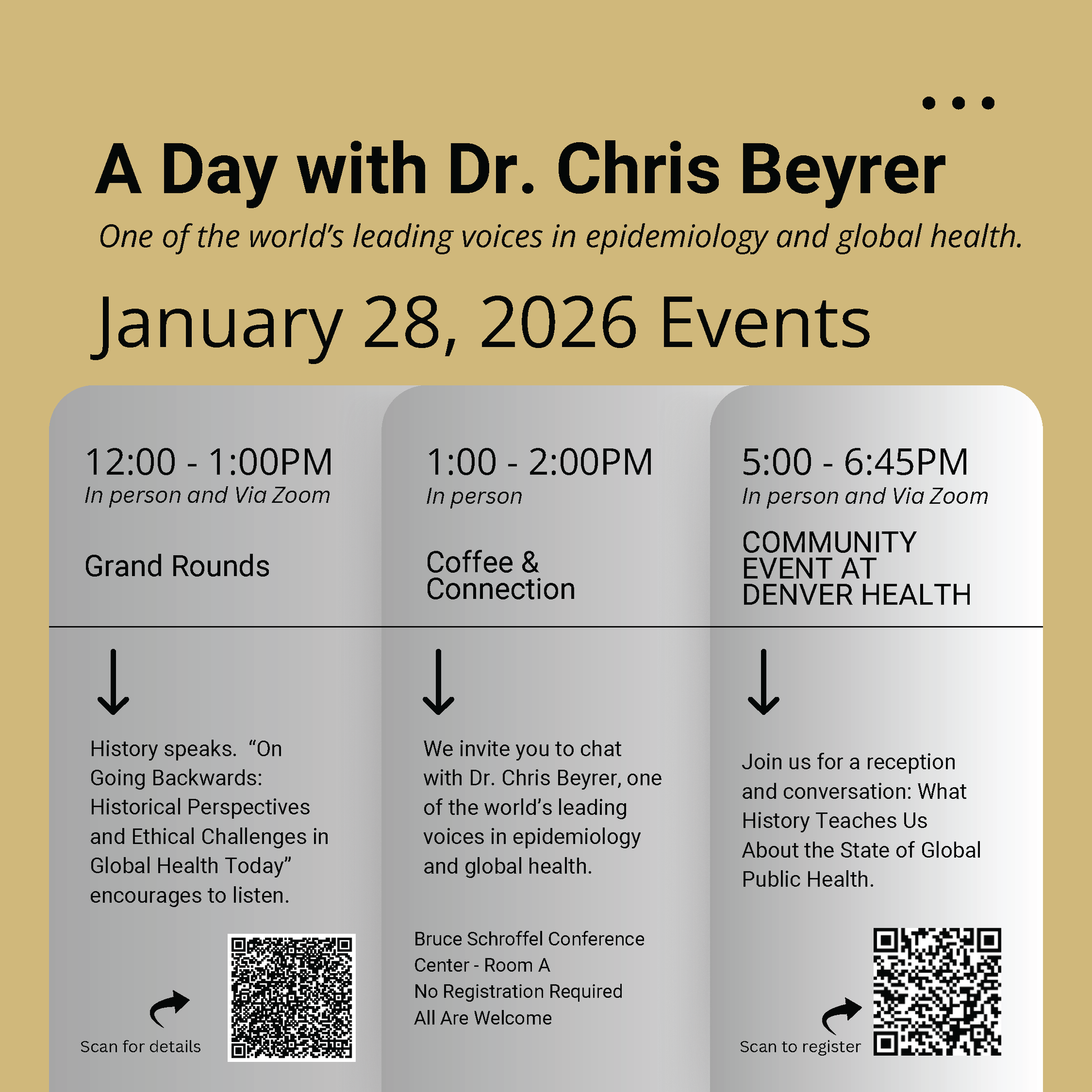 The Holocaust, Genocide and Contemporary Bioethics Program at the Center for Bioethics and Humanities at CU Anschutz, is hosting A Day with Chris Beyrer, MD, MPH, one of the world’s leading voices in epidemiology and global health, on Wednesday, Jan. 28. The day includes three events, offering multiple ways to engage.