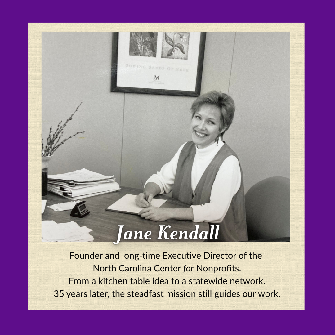 As the Center celebrates 35 years of supporting North Carolina’s nonprofits, we’re taking a look back at some of the milestones, memorable moments, and faces that have shaped our journey. Did you know… Founder and first Executive Director Jane Kendall conceived of the Center sitting at her kitchen table. |